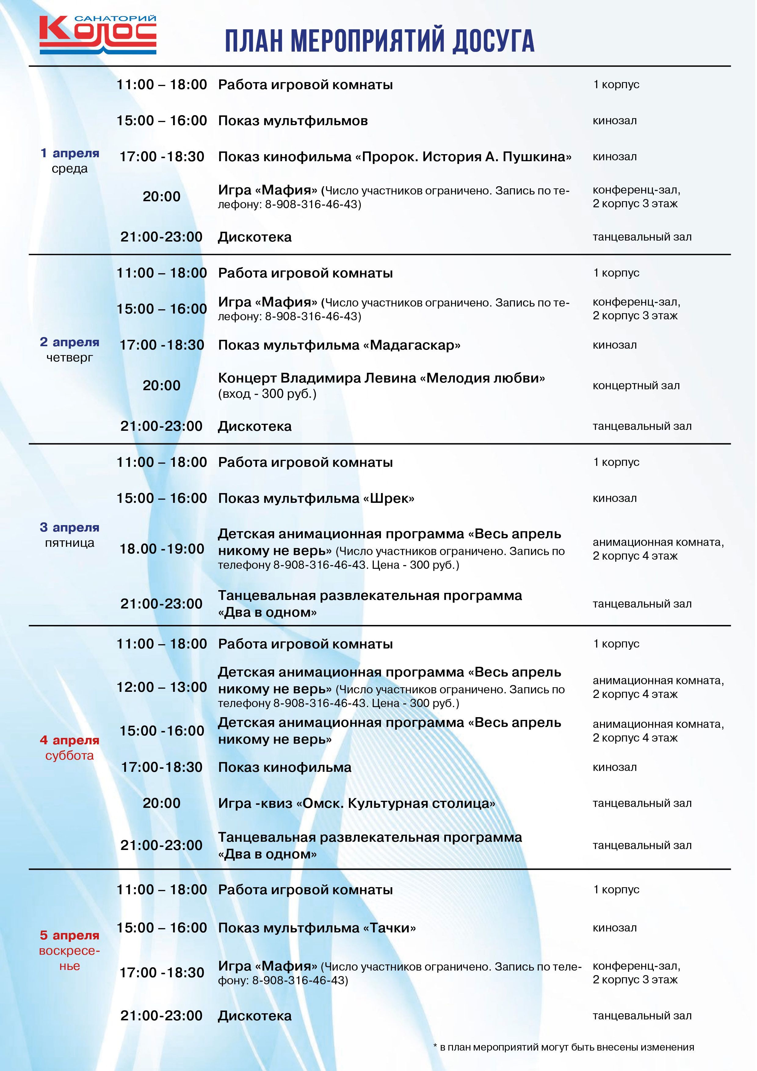 Программа досуговых развлекательных мероприятий санатория "Колос"