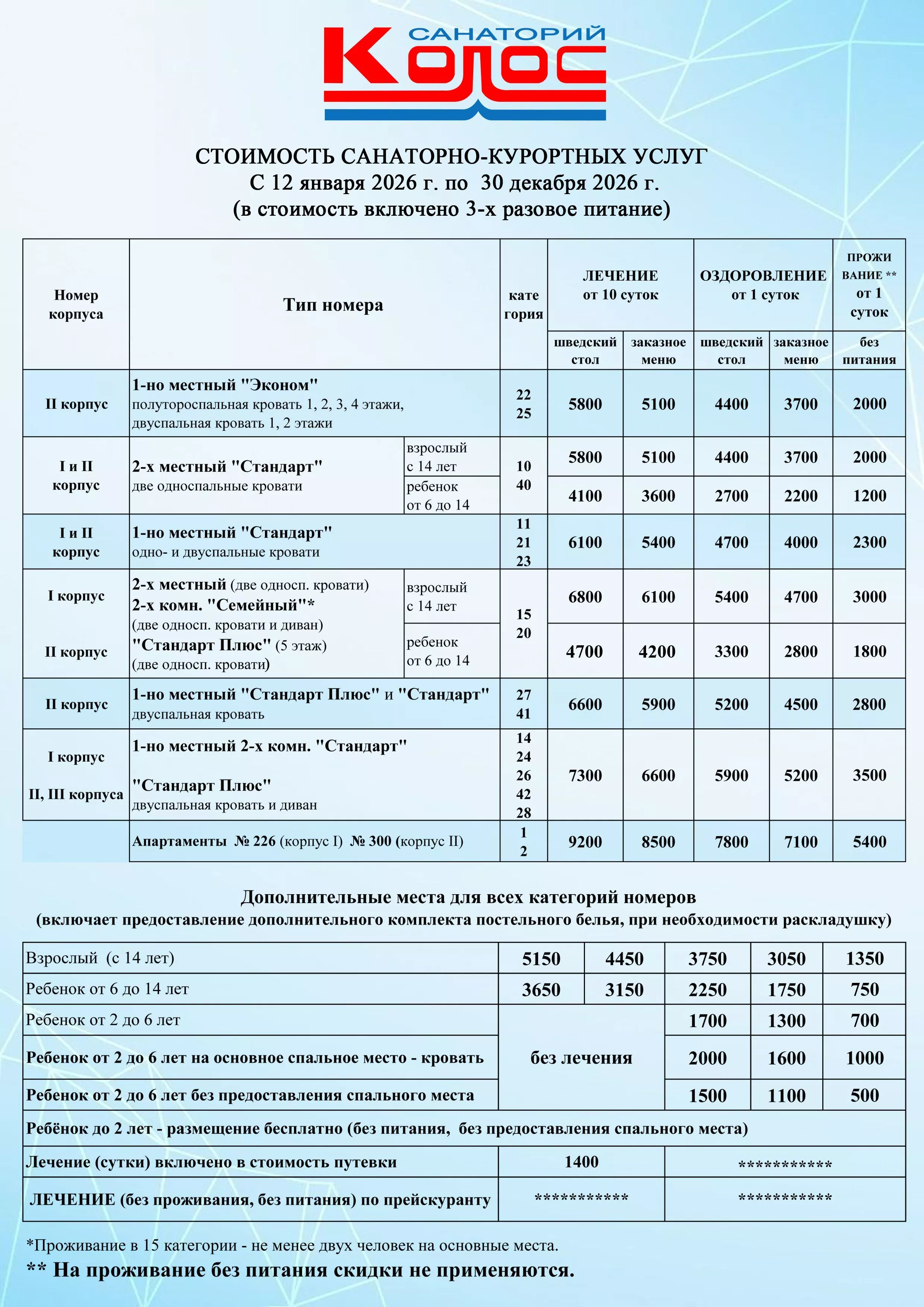 Прайс на путевки с 12.01.2026 по 30.12.2026г