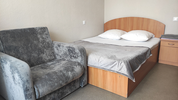Возможно размещение до 3 человек, при этом второй человек размещается на двуспальной кровати, третий на кресле-кровати.